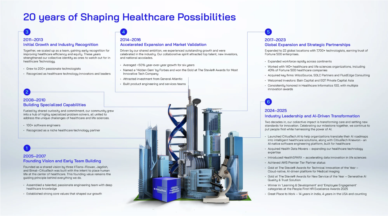 Healthcare is in our DNA is a declaration of our vision and values. At CitiusTech, healthcare and life sciences aren’t just sectors we serve – it’s woven into the very fabric of who we are. From our inception, we’ve been driven by a singular vision to inspire new possibilities for the health ecosystem with technology and human ingenuity. We constantly strive to solve healthcare’s greatest challenges with technology, creativity and agility. Together with our clients and partners, we aim to accelerate the transition to a human-first, sustainable and digital health ecosystem. We are proud of our legacy and excited about the future, as we continue to innovate and lead the way in healthcare technology.